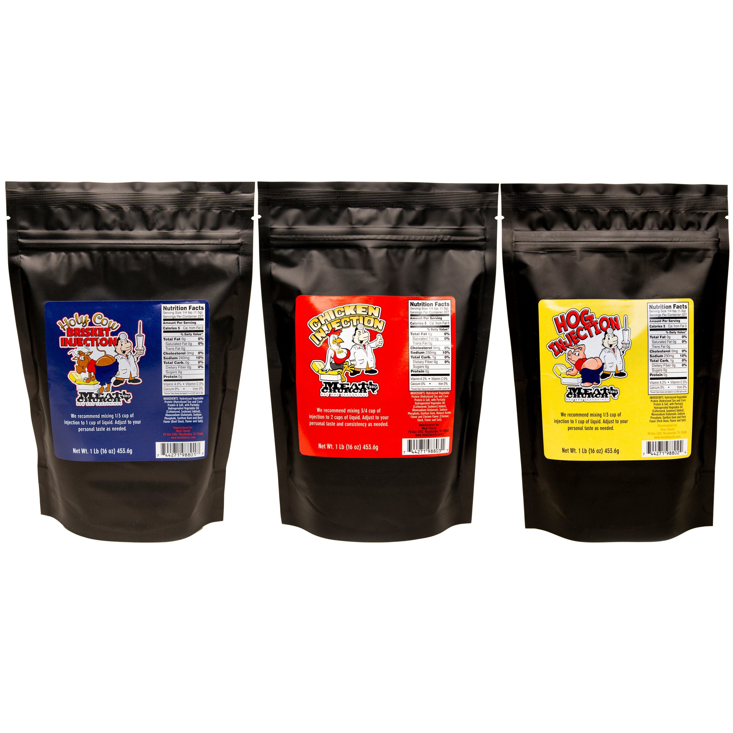 All 3 of our injections for the lowest price of $43. 1 Holy Cow Brisket Injection. 1 Pork Injection. 1 T-Bird’s Chicken Injection. That’s 3 lbs of injection. You won’t find a better deal on injections online!
